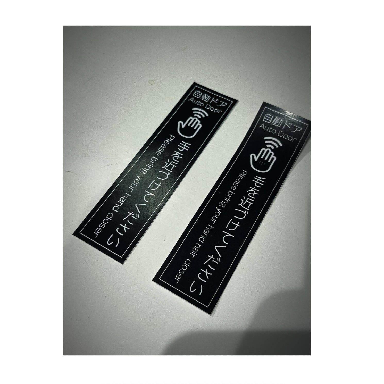 手を近づけてください、じゃなく、 毛を近づけてください、です。 Please bring your handhair closer. 通常の「手を近づけてください」と「毛を近づけてください」の2枚セットになります。 屋外用の耐水耐候性に優れてる素材を使用していますので、車や窓や水筒に貼ることにも適しています。 サイズ(1枚):横 約3.5cm×縦 約13.5cm ※ステッカーの印刷に若干のブレがありますが予めご了承ください。